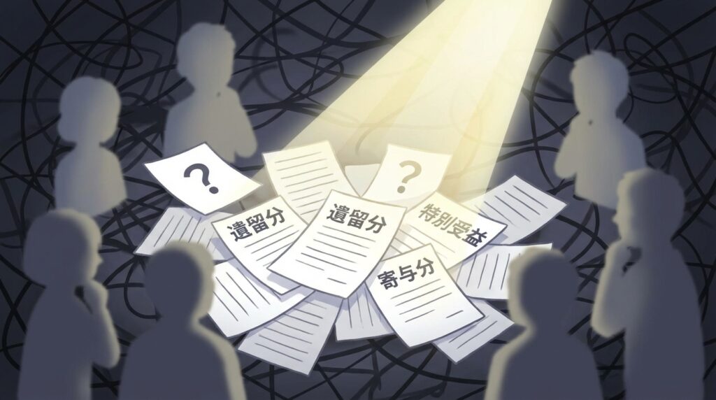 ご家族が亡くなり、相続の手続きを進めていると、「遺留分」「特別受益」「寄与分」といった、普段聞き慣れない言葉を目にすることがありますよね。それぞれの意味がはっきりせず、他の相続人との話し合いの中で「自分の取り分はどうなるのだろう?」と不安に感じてしまう方も少なくありません。